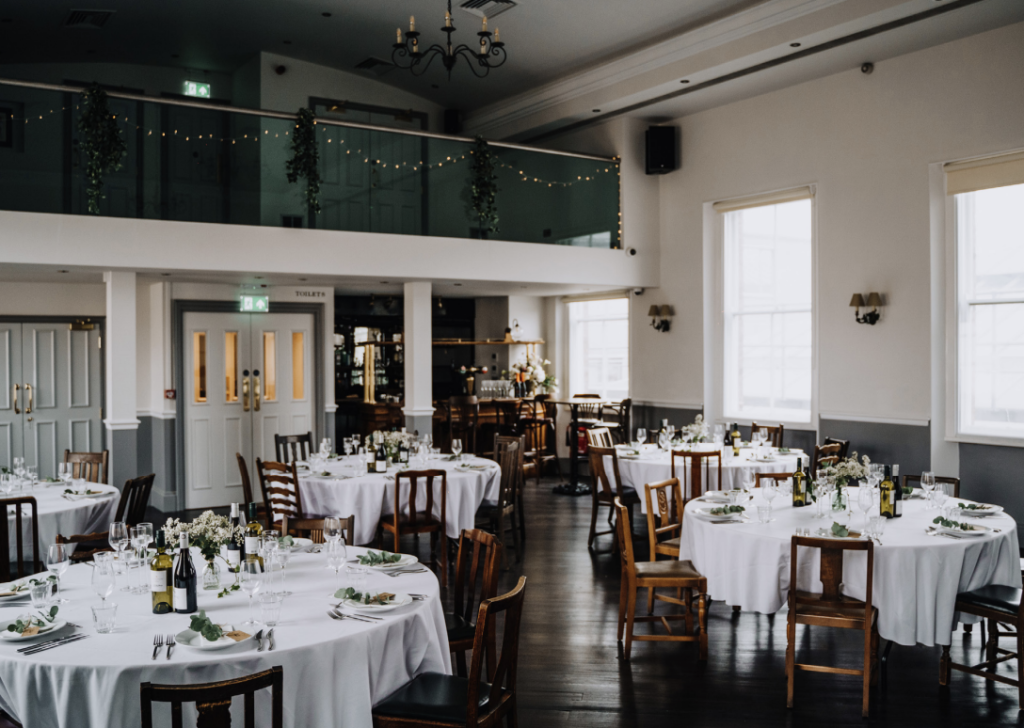 Clarence Hall, located on the second floor of The Admiral Hardy. It features double-height ceilings and a private bar, with ample space for seated guests, a dance floor, and live entertainment such as a DJ or band. More intimate occasions can be hosted in The Hardy Room, perfect size for smaller receptions, ceremonies, or private dining/parties.